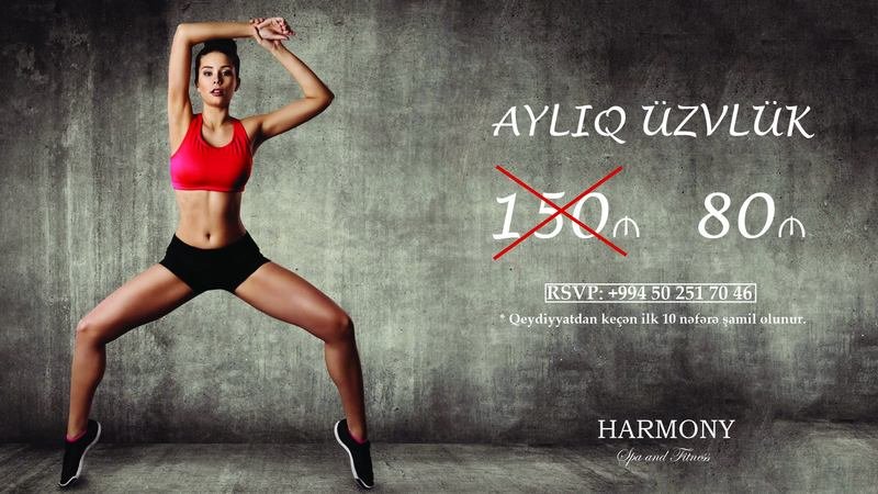 Harmony SPA & Fitness yalnız dekabr ayının 29-na qədər qeydiyyatdan keçən ilk 10 nəfərə fitnesə aylıq üzvlük 150 AZN deyil, 80 AZN olacaq.