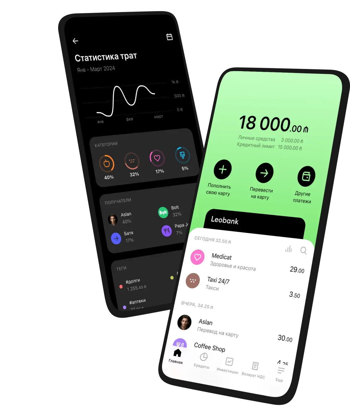 - Мгновенные переводы между картами Leobank и другими банками.